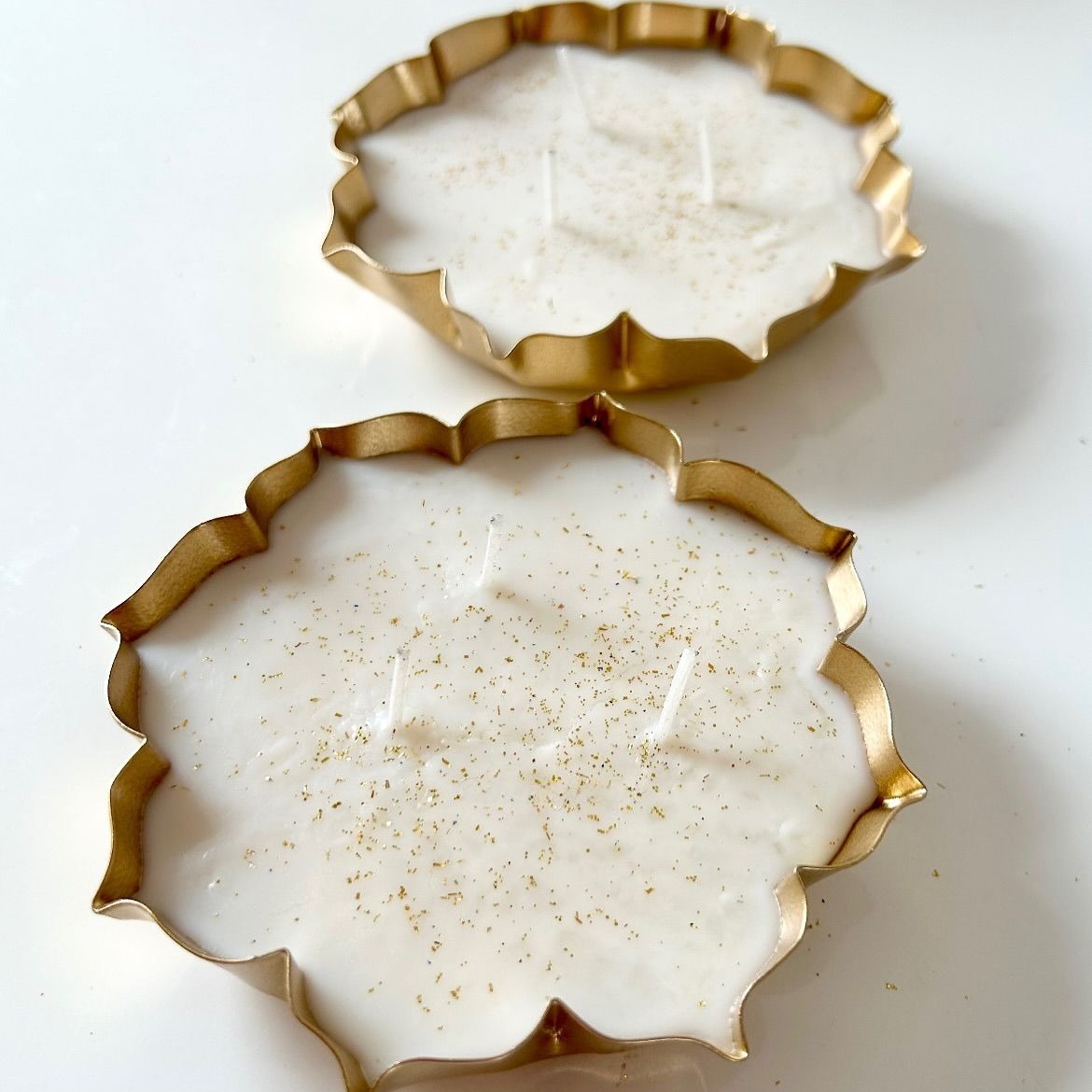 These exquisite Brass Flower Platters Filled with Fragrance Wax blend traditional elegance with a calming aromatic touch.