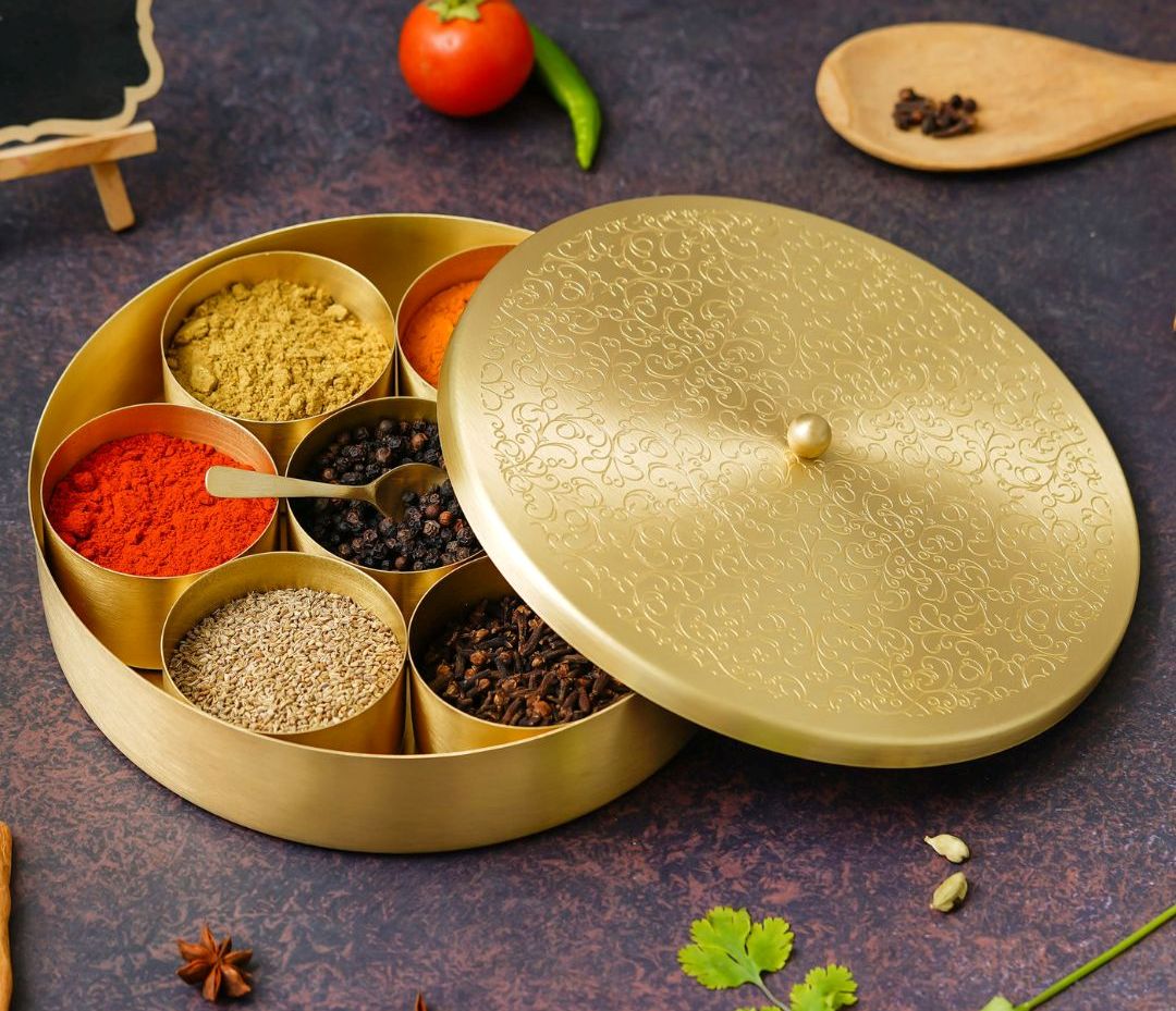 This traditional Brass Masala Box is perfect for storing a variety of spices in one elegant container.