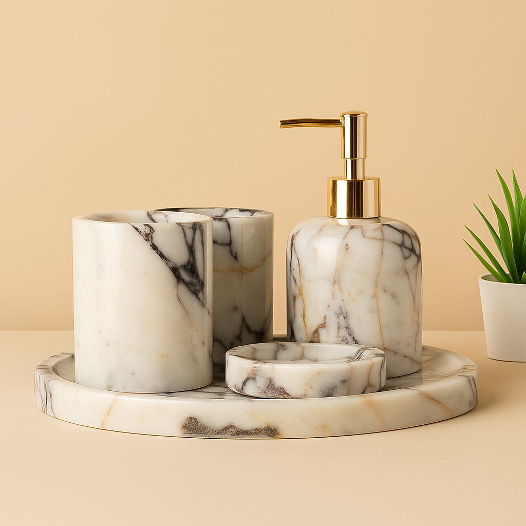 Crafted from premium marble, it includes a soap dispenser, tumbler, and tray for a cohesive look.
