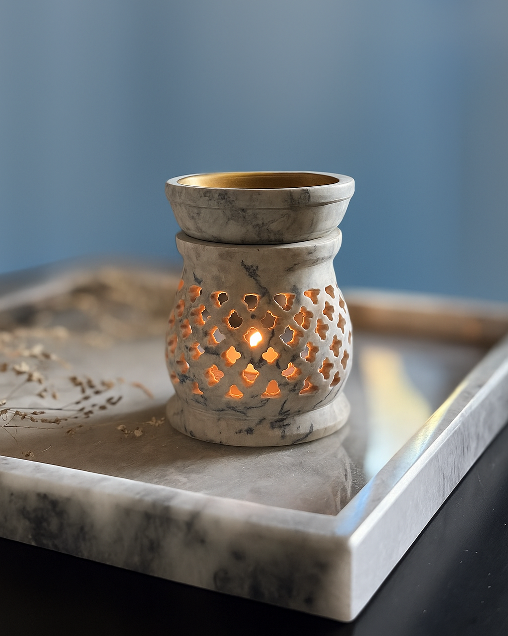 Elevate your space with this elegant Marble Oil Burner, crafted from premium stone with intricate cut-out detailing.