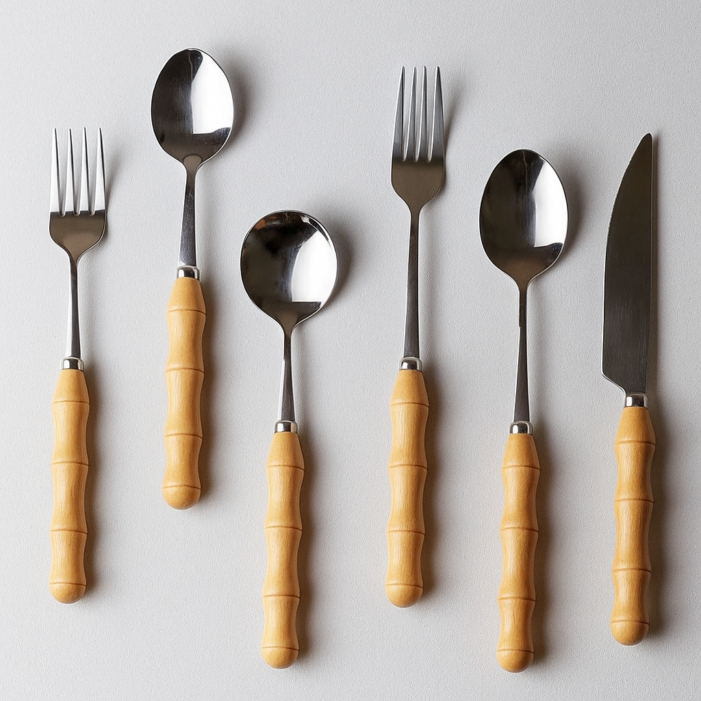 This stainless steel cutlery set features ergonomic bamboo-inspired handles for a natural, stylish touch.