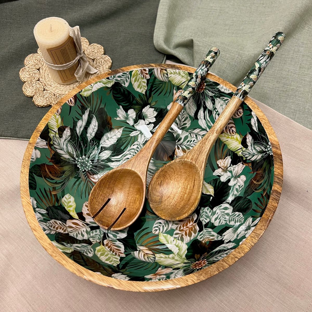 This elegant Wooden Bowl with Cutlery and Glossy Resin Coating is perfect for serving salads, fruits, or snacks in style.