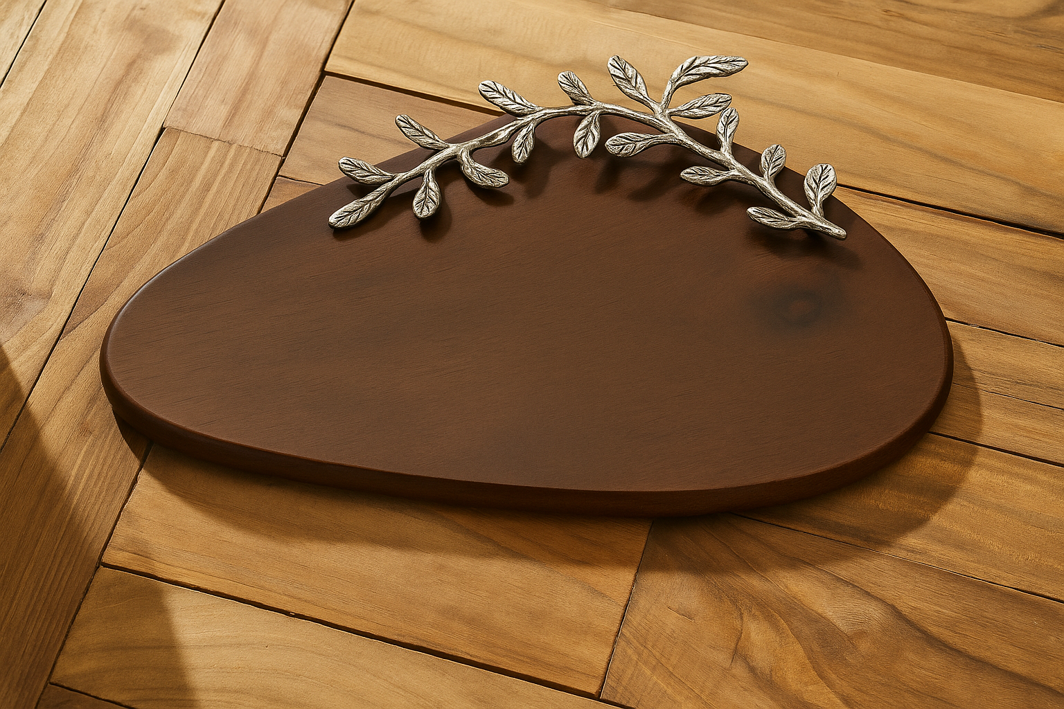 This exquisite Wooden Platter with Metal Casted Leaf Handle blends natural beauty with artistic detail.