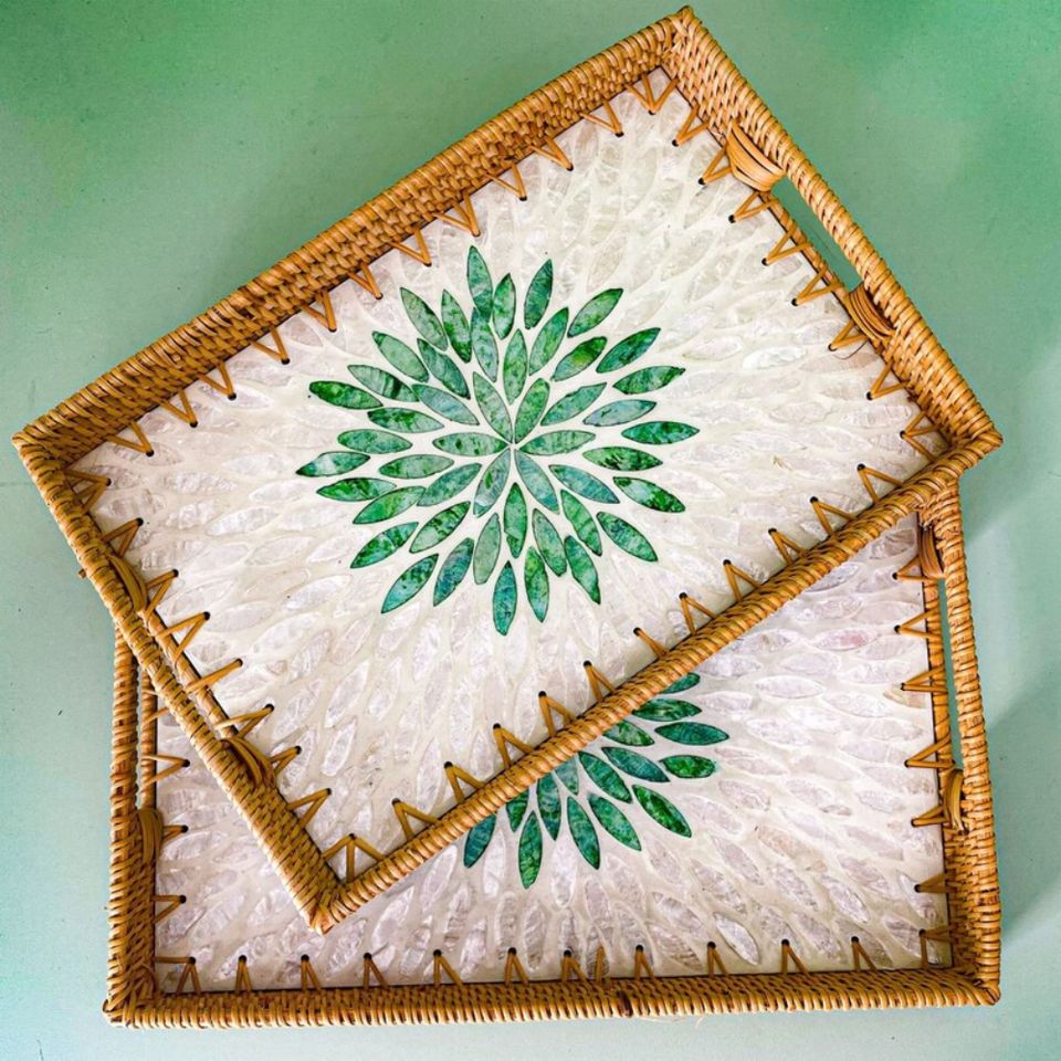 The hand-assembled MOP inlay adds a luxurious shimmer, enhancing the tray’s organic bamboo base.