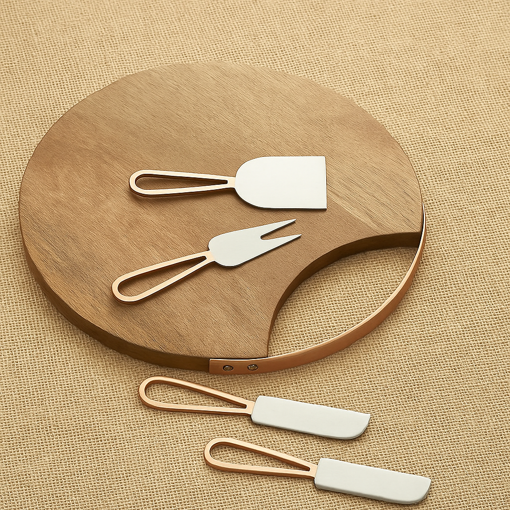 This elegant Wooden Round Platter comes paired with sleek cutlery, perfect for serving cheese, snacks, or appetizers.